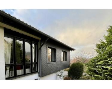 Das Haus selbst thront auf einem idyllischen Hügel am Ende einer ruhigen Straße. Direkt angrenzende, landwirtschaftlich genutzte Flächen sorgen für einen unverbaubaren Blick und absolute Privatsphäre. Vom Wohnzimmer aus eröffnet sich Ihnen ein atemberaubendes Panorama: Der Blick schweift über den nahegelegenen Essigberg und reicht bei klarer Sicht sogar bis ins beeindruckende Rothaargebirge.
