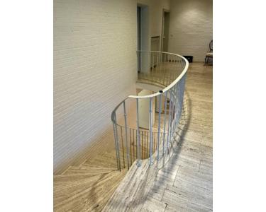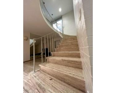 Ein eleganter Travertinboden verleiht dem Haus eine zeitlose, luxuriöse Note und erstreckt sich von der großzügigen Eingangshalle über die stilvoll geschwungene Treppe bis in den weitläufigen Flur der ersten Etage sowie das beeindruckende, ca. 45 m² große Wohnzimmer.