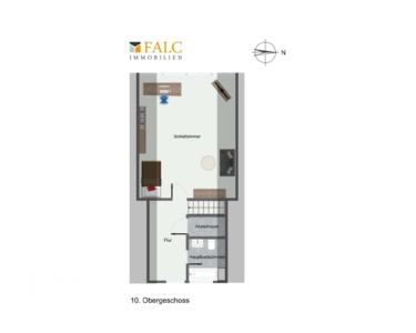 In der oberen Etage befindet sich ein großer, sehr heller Wohn-, Schlafbereich ebenfalls mit Klimaanlage, sowie ein Tageslicht-Bad mit Badewanne und ein Abstellraum, Der Wohn-, Schlafbereich und Flur sind mit Parkett ausgelegt, Bad und Abstellraum jeweils gefliest.
