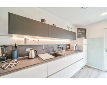 Wohn-, Ess- und Kochbereich mit 49 m² das Herzstück des Hauses. Der gesamte Wohnbereich wird von drei Seiten mit Tageslicht durchflutet. Die Küche ist übereck
