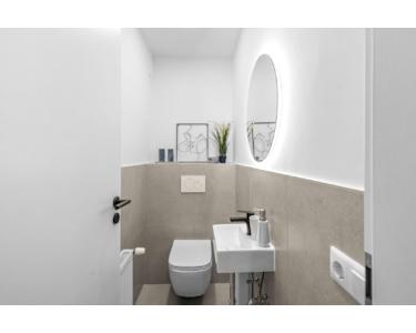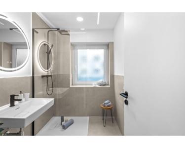 Das Badezimmer überzeugt mit einer großzügigen Regendusche, geschmackvollen Fliesen, einem eleganten LED-Spiegel und stilvollen Armaturen. Auch das separate WC wurde komplett modernisiert. Glatt verspachtelte Wände, neuer Putz und moderne Innentüren schaffen ein zeitgemäßes Ambiente. LED-Beleuchtungen mit Spots und Lichtleisten in Küche, Bad, Flur und WC setzen gezielte, stimmungsvolle Akzente.