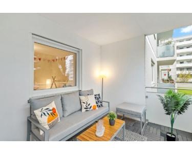 Der großzügige Wohn- und Essbereich punktet mit einer lichtdurchfluteten Atmosphäre dank großer Fenster und dem Zugang zu einem nach Süden ausgerichteten Balkon, der eine grüne Aussicht bietet – perfekt für entspannte Stunden im Freien. Die Küche ist mit allen notwendigen Anschlüssen ausgestattet und ermöglicht eine individuelle Gestaltung. Zusätzlich steht ein Waschmaschinenanschluss zur Verfügung. Die beiden Schlafzimmer überzeugen mit großzügigem Zuschnitt und einer ruhigen Lage.