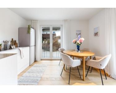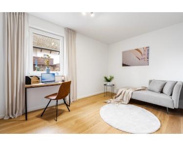 Die angebotene Wohnung Nr. 7 im Dachgeschoss erstreckt sich über zwei Wohnebenen, verfügt über ca. 87 m² Wohnfläche, 3 Zimmer, ein modernes Tageslichtbad mit Dusche, und eine großzügige Dachterrasse. Zur Wohnung gehören außerdem ein Abstellraum im Untergeschoss sowie ein Carport mit separater Abstellmöglichkeit.
