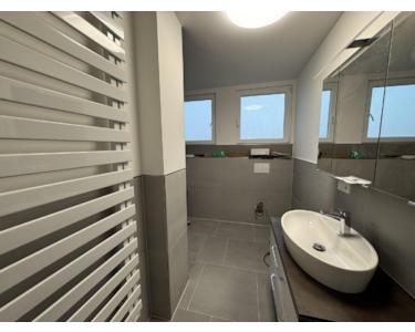 •Moderne Badezimmer: Stilvolle Sanitärausstattung und barrierefreie Dusche.