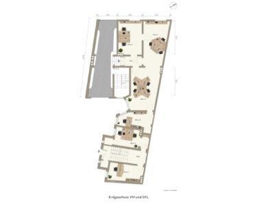 Die angebotene Bürofläche liegt im Erdgeschoss des Hauses und erstreckt sich über den linken Seitenflügel.