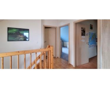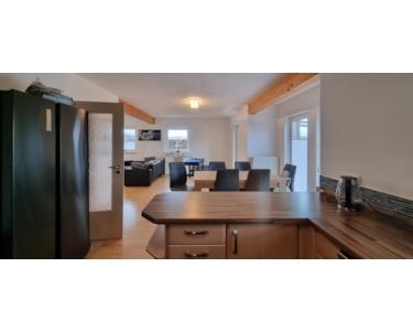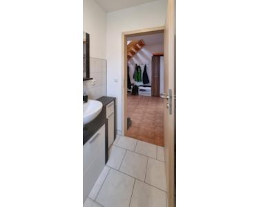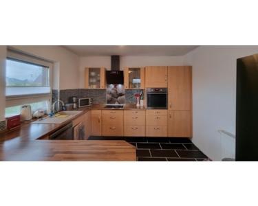 Der Eingangsbereich ist großzügig, so dass der Besuch sich nicht vor dem Eingang stauen muss. Von hier gehen der Hauswirtschaftsraum, das kleine WC und der Wohn-Küchenbereich ab – siehe Video bzw. Bilder. Auf der rechten Seite befindet sich die Küche mit mehr Platz und Stauraum als üblich. Diese als „U“ gehalten Küche ermöglicht es alles, was benötigt wird, schnell zur Hand zu haben. Gleich dahinter ist der große Essplatz mit gut 8 Plätzen. Hier ist die Köchin oder der Koch gleich mitten drin, kann mit seinen Gästen reden.