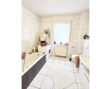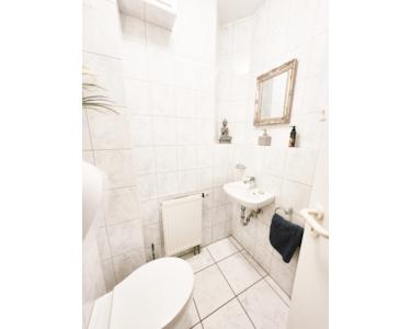 Neben einem weiß gefliesten Badezimmer mit Badewanne und Fenster haben Sie ein gesondertes Gäste WC im vorderen Teil der Wohnung.