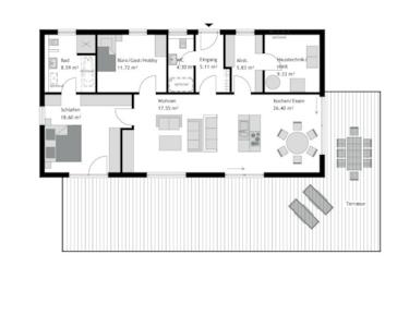 Der moderne Winkelbungalow mit Walmdach präsentiert einen Entwurf, der mit einem lichtdurchfluteten Wohn-/Ess- und Kochbereich von 51 m² das Herzstück bildet. Hier ist ausreichend Platz für eine großzügige Küche, eine Kochinsel, einen geräumigen Essbereich und einen Wohnbereich mit TV, um allen Wohnbedürfnissen gerecht zu werden. Die Grundrissplanung umfasst zudem einen gemütlichen Schlafbereich mit Ankleide und Bad in einer durchdachten Raumfolge. Ein praktischer Raum für die Hauswirtschaft ist direkt an dieses Refugium angeschlossen, um die Wäsche dort zu versorgen, wo sie anfällt. Eine geräumige Diele, ein optional gestaltetes Duschbad sowie ein zusätzlicher Raum, der flexibel als Büro, Gäste- oder Hobbyraum genutzt werden kann, vervollständigen das Raumangebot. Der Eingangsbereich ist durch den Gebäudewinkel überdacht und verleiht dem Gesamtbild eine einladende Note.