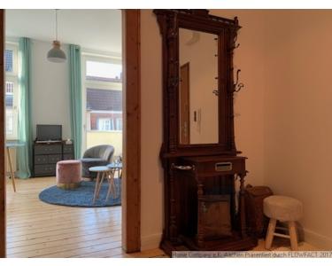 Die Etagenwohnung liegt im 3.OG eines Mehrfamilienhauses. In der Diele wird man von einer antiken Garderobe mit Spiegel empfangen.