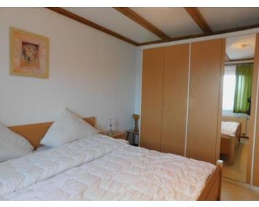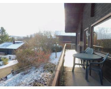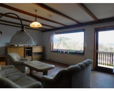 Der größte Teil der Wohnung wird vom angrenzenden Wohnzimmer eingenommen, das mit seiner großen Fensterfront zum Tal hin ausgerichtet ist. Von hier und vom davorliegendem und rundum verlaufenden Balkon kann man einen herrlich Blick über den angrenzenden Hochwald und den Ort Thalfang bis hin zum Erbeskopf genießen.