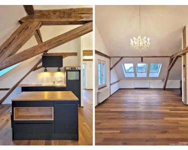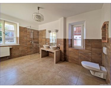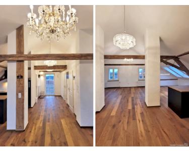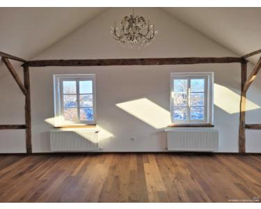 • Bodenarten: Originale, aufbereitete Holzdielen, moderne Fliesen im Bad
