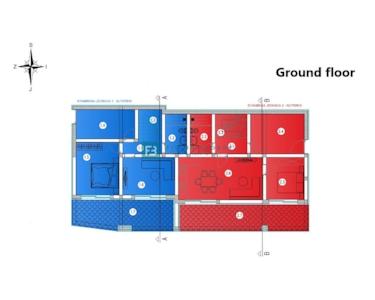 ERDGESCHOSS – besteht aus Flur, Badezimmer, Treppenhaus, Technikraum/Abstellraum, Schlafzimmer 1, Wohnzimmer mit Zugang zur überdachten Terrasse, wo sich ein Swimmingpool von 19,50 m2 und ein Garten von 174,50 m2 befinden