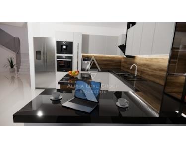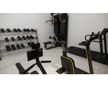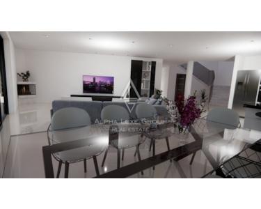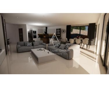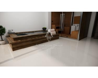Erdgeschoss (177,10 m²): Genießen Sie nahtlosen Luxus im großzügigen offenen Wohnbereich mit Wohnzimmer, Essbereich und Küche, inklusive Kamin. Diese Ebene umfasst auch ein Gäste-WC, einen Wellnessbereich mit Sauna und Fitnessraum, ein Schlafzimmer mit eigenem Bad, einen Abstellraum und eine separate traditionelle Taverne. Große Glaswände öffnen sich zu einer überdachten Terrasse mit einer Außenküche und einem großen Essbereich, angrenzend an einen durch eine Wärmepumpe beheizten Swimmingpool, umgeben von einer ausgedehnten Sonnenterrasse.