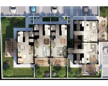 Das Erdgeschoss empfängt Sie mit einer Eingangshalle und Garderobe, die zu einem geräumigen Wohnbereich führt, der eine Küche und einen Essbereich integriert. Diese Etage bietet auch einen Waschraum, eine Gästetoilette und einen Technikraum. Glaswände im Wohnbereich ermöglichen den Zugang zu einer überdachten Terrasse, die eine nahtlose Verbindung zum Außengarten schafft. Das zweite Stockwerk verfügt über zwei große Schlafzimmer, jedes mit einem eigenen Badezimmer, wobei ein Schlafzimmer auch einen persönlichen Kleiderschrank von 6,25 m2 umfasst. Die Reise führt weiter in das dritte Stockwerk, das ein zusätzliches Schlafzimmer mit einem Badezimmer und Zugang zu einer ausgedehnten Terrasse beherbergt. Die Residenz ist mit modernster Fußbodenheizung, betrieben durch eine Wärmepumpe, und Klimaanlagen ausgestattet.