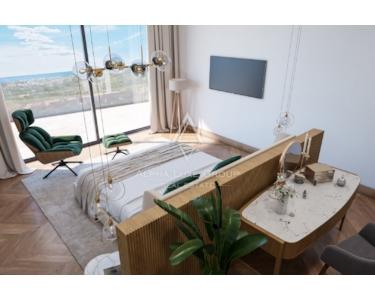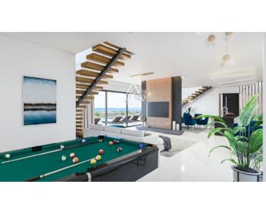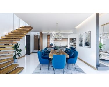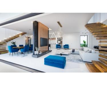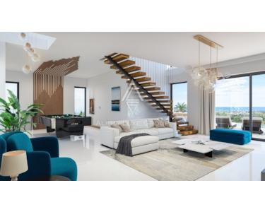 Diese Villa, eine meisterhafte Mischung aus Innovation und Tradition, zeichnet sich durch elegante Linien und Formen aus, die mit natürlichen Elementen harmonieren. Der Einsatz von großen Glaswänden flutet das Innere mit natürlichem Licht, verstärkt das Raumgefühl und verbindet das Innenleben mit der ruhigen Außenlandschaft.