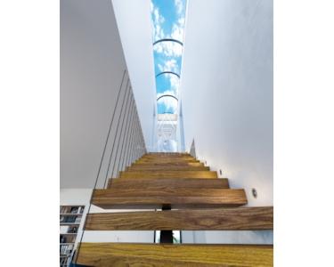 Ein besonderes Merkmal sind die einzigartigen Öffnungen im Dach, die sich über die gesamte Länge oberhalb der Treppe erstrecken und nicht nur Tageslicht einladen, sondern auch ein Gefühl von Freiheit und Verbindung mit den Außenelementen bieten. Nachts bieten diese Öffnungen einen faszinierenden Blick auf den Sternenhimmel und schaffen eine außergewöhnliche Atmosphäre im Haus.