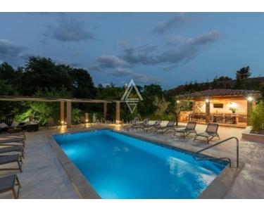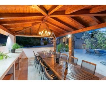 Das riesige 5000 m² große Grundstück bietet acht Parkplätze und verfügt über einen 32 m² großen Swimmingpool. Neben dem Pool befindet sich eine geräumige überdachte Terrasse mit einem Essbereich im Freien und einem Grill, ideal für verschiedene Freizeitaktivitäten.
