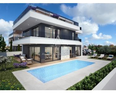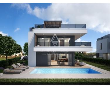 In den ruhigen Außenbezirken von Poreč steht jetzt eine freistehende Villa zum Verkauf, die ein idyllisches Refugium bietet. Auf einer Fläche von 220 m2 erstreckt sich die Villa über drei Ebenen, einschließlich eines Erdgeschosses, eines ersten Stockwerks und einer großzügigen 70 m2 großen Dachterrasse, komplett mit Sauna, Bad und zwei Abstellräumen.