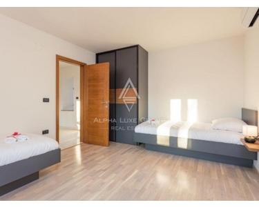 Im Erdgeschoss der Villa befinden sich eine geräumige Küche mit Essbereich, ein gemütliches Wohnzimmer und ein Badezimmer. Ein kleiner Abstellraum nutzt den Raum zwischen den Stockwerken effizient. Das erste Obergeschoss bietet zwei Schlafzimmer, einen Gemeinschaftswohnbereich und ein Badezimmer, während das Dachgeschoss zwei weitere Schlafzimmer, ein zusätzliches Badezimmer und eine Sauna beherbergt, was Komfort auf jeder Ebene garantiert.