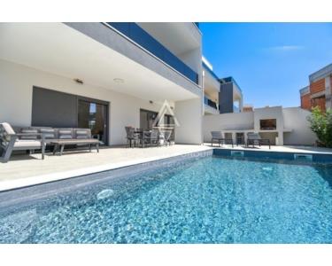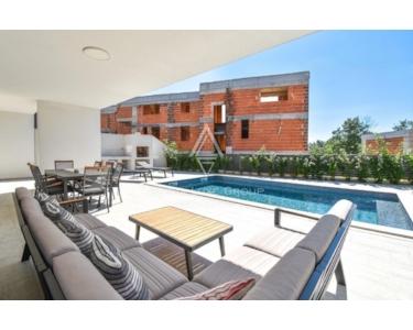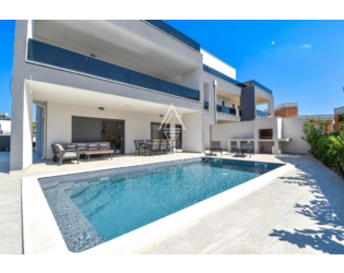 Erleben Sie luxuriöses Wohnen in dieser atemberaubenden Doppelhaushälfte, die nur 900 Meter vom Adriatischen Meer und nur 8 Kilometer von der lebhaften Stadt Poreč entfernt liegt. Diese exquisite Immobilie, die sich über drei Etagen und 280 m² erstreckt, steht jetzt zum Kauf bereit.