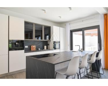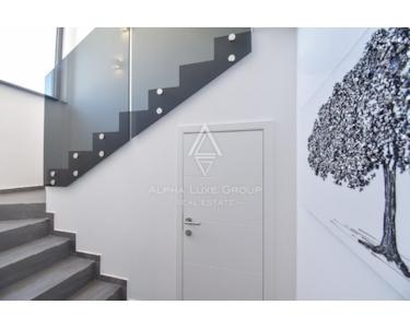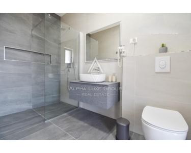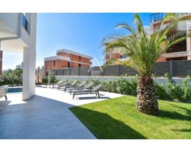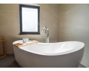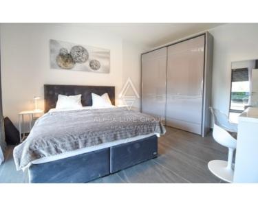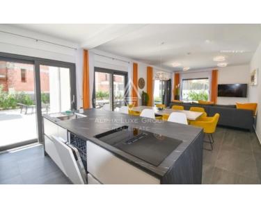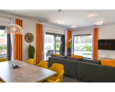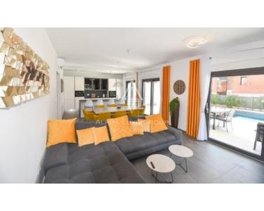 Im sorgfältig gestalteten Garten befindet sich ein atemberaubender Swimmingpool, komplett mit Sonnenliegen, einer Außenküche und einem geschützten Sitzbereich für ultimative Entspannung. Die Heizung und Kühlung der Villa wird effizient durch zentrale Fußbodenheizungssysteme, die durch eine Wärmepumpe betrieben werden, ergänzt durch sechs Inverter-Klimaanlagen. Große, nach Südwesten ausgerichtete Glaswände mit elektrischen Rollläden sorgen den ganzen Tag über für eine helle Atmosphäre.