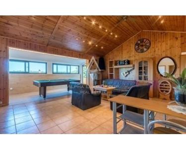 Diese Etage beherbergt auch vier großzügige Schlafzimmer, ergänzt durch vier gut ausgestattete Bäder, einschließlich eines bequem vom Außenbereich zugänglichen Gästebades. Eine Außentreppe führt zum eigenständigen Obergeschoss, das mit zwei zusätzlichen Schlafzimmern, einem gemeinsamen Bad, einer Kochnische und einem geräumigen Wohnbereich mit Billardtisch und einer Terrasse ausgestattet ist, die einen Panoramablick auf die idyllische Umgebung bietet.