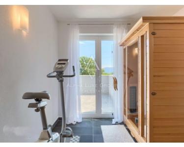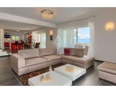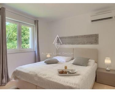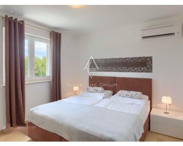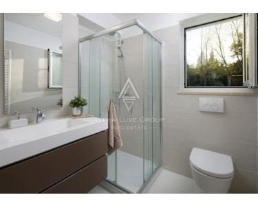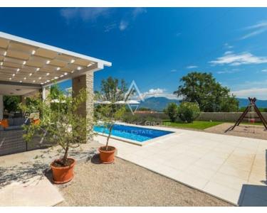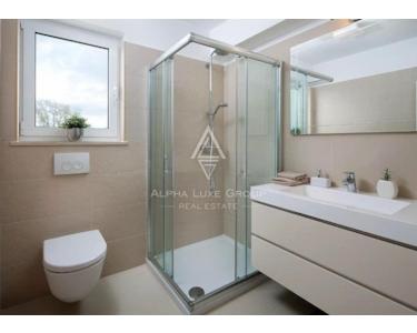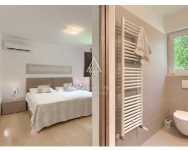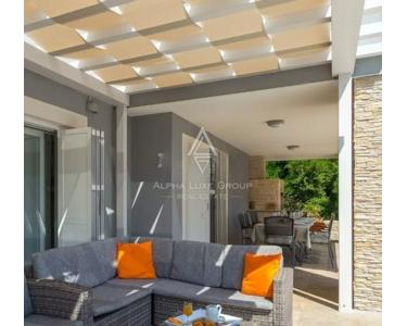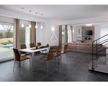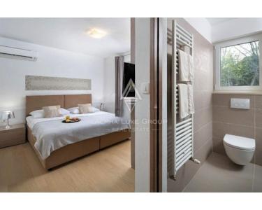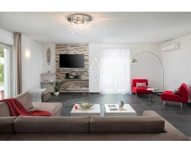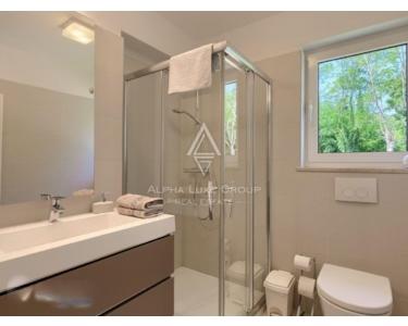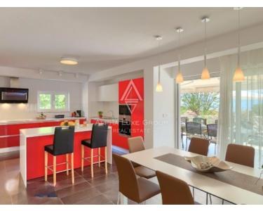Zum Verkauf steht eine moderne Villa in der Nähe von Labin. Diese Immobilie, geschmückt mit sanften, eleganten Farbtönen, erstreckt sich über 180m² auf zwei Etagen und ist vollständig mit erstklassigen Annehmlichkeiten ausgestattet. Sie verfügt über umweltfreundliche Heiz- und Kühlsysteme mittels Wärmepumpen. Das Erdgeschoss bietet ein minimalistisches Wohnzimmer, einen Essbereich, eine Küche, ein Badezimmer und ein Schlafzimmer mit eigenem Bad. Das Wohnzimmer öffnet sich auf eine geräumige überdachte Terrasse mit Kamin und Lounge-Bereich. Im ersten Stock befindet sich eine Infrarotsauna und eine Terrasse, die einen Panoramablick auf die malerischen Hügel bietet, zusammen mit drei Schlafzimmern, jeweils mit privaten Bädern. Das Äußere, ein mediterran gestalteter Garten von 24m², ist wunderschön angelegt mit automatischer Bewässerung und umfasst einen Swimmingpool, einen Sonnenbereich, einen Kinderspielplatz und Parkplätze.