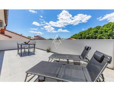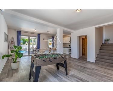 Zum Verkauf steht ein wunderschön renoviertes, Doppelhaus mit eigenem Swimmingpool. Das Anwesen ist geschickt in zwei spiegelbildliche Abschnitte aufgeteilt, die jeweils vollständige Privatsphäre mit separaten Eingängen bieten. Der zum Kauf stehende Teil umfasst eine Garage und erstreckt sich über zwei Ebenen. Das Erdgeschoss verfügt über eine einladende Eingangshalle, eine offene Küche, Ess- und Wohnbereich, sowie ein Schlafzimmer und ein Badezimmer. Die obere Etage beherbergt drei weitere Schlafzimmer, zwei Badezimmer, einen Abstellraum und Zugang zu einer malerischen Terrasse.
