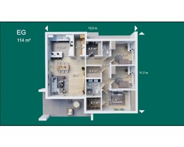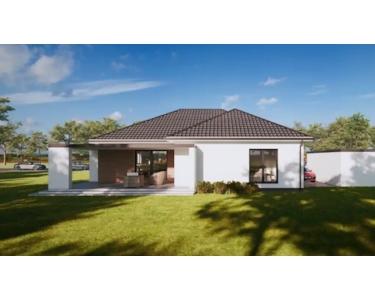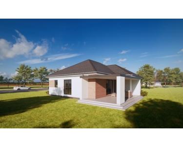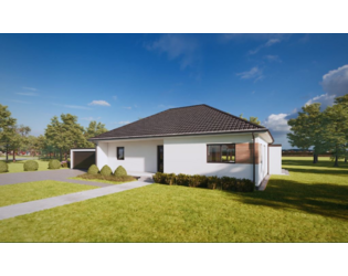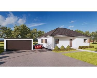 1-geschossiges Bungalow mit vier Zimmern, Garderobe, offener Küche, Bad, Gäste-WC, Technikraum und Diele.