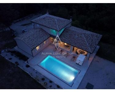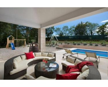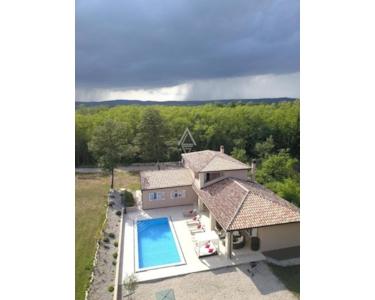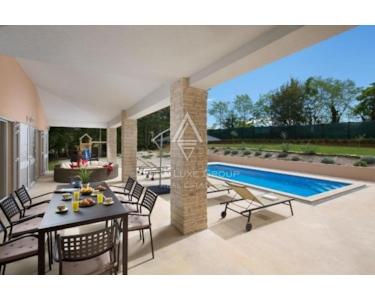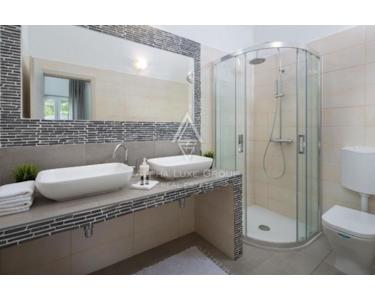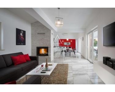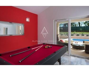 Im Erdgeschoss befindet sich ein großzügiger offener Raum, der eine Ecke mit Billardtisch, ein Wohnzimmer, ein Esszimmer und eine Küche mit Zugang zu einer geräumigen überdachten Terrasse umfasst. Zwei Schlafzimmer mit eigenem Bad, Gäste-WC und Abstellraum befinden sich auf derselben Etage.