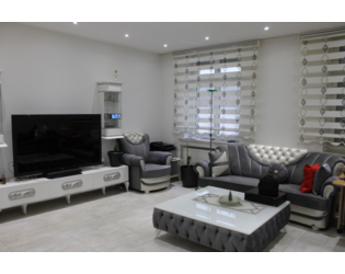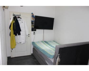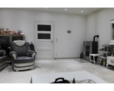 ein Laminatboden verlegt, außer im Wohnzimmer ein Parkettboden. Die