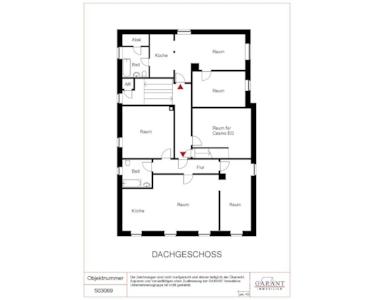 * Dachgeschoss links (ca. 54 qm): zwei Zimmer, Küche, Bad