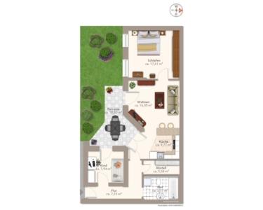Die Terrasse, die direkt von der Wohnküche zugänglich ist, lädt zu entspannten Stunden im Freien ein und bietet Raum für Pflanzen und Outdoor-Möbel. Ein perfekter Ort, um die frische Luft zu genießen und den Alltag hinter sich zu lassen.