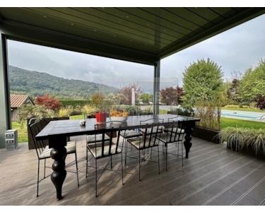 Die große Außenpergola bietet angenehme Momente der Entspannung im Freien, geschützt vor der Sonne.