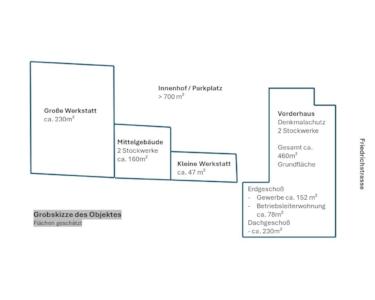 Dieses Wohn- und Geschäftshaus mit einer Gewerbefläche/Grundfläche von ca. 460 m² über zwei Etagen wurde im Jahre 1634 errichtet und dann mit zwei weiteren Anbauten erweitert. Zum einen mit der Errichtung von einem Anbau mit ca. 47 m² Grundfläche und Dachboden aus dem Jahre 1939 und mit einem weiteren Anbau einer Halle mit ca. 160 m² Grundfläche über zwei Etagen aus dem Jahre 1963 und eine Werkhalle mit ca. 230 m² und großem Rolltor erweitert. Das Objekt ist in der Geschäftsstraße auf einem Grundstück von ca. 1.505 m² untergebracht. Ein weiteres Highlight ist der eigene Innenhof oder Parkplatz mit seinen ca. 700 m² hinter dem Haus.