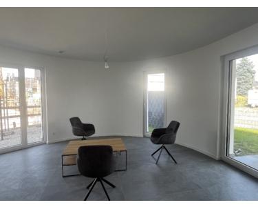 Große Fensterflächen sorgen für eine helle, einladende Atmosphäre, die markante Rundung im Wohnbereich wird garantiert zum Blickfang. Vom Wohnbereich aus gelangen Sie auf die sonnige Terrasse ideal für entspannte Stunden an der frischen Luft. Der angrenzende Garten gehört zu Ihrem Sondernutzungsrecht.