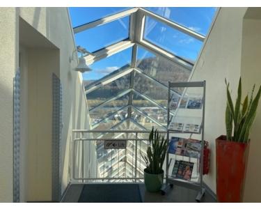 Das einladende Gästehaus, welches 1985 eröffnet wurde, mit seiner besonderen Architektur, wirkt ebenfalls sehr einladend. Das lichtdurchflutete Treppenhaus stellt einen besonderen Höhepunkt des Gästehauses. Das vorhandene Lichtband ermöglicht einen fantastischen Blick auf die Schwäbische Alb. Im Gästehaus gibt es insgesamt 6 Ebenen, die Sie jeweils bequem mit dem Aufzug erreichen können.
