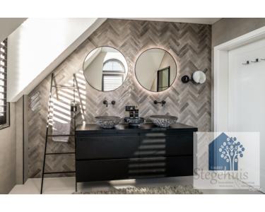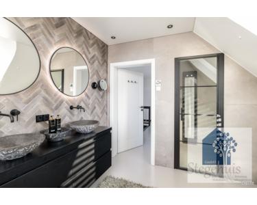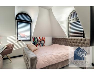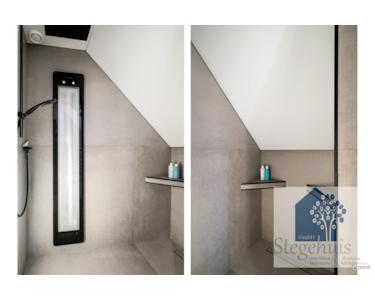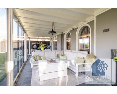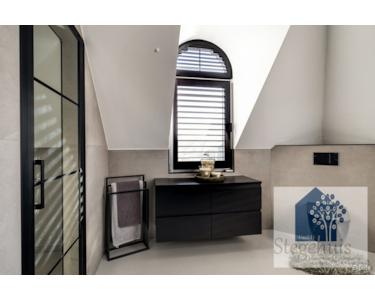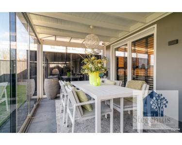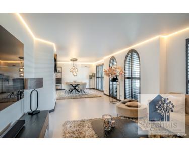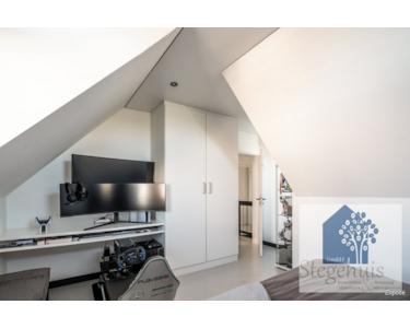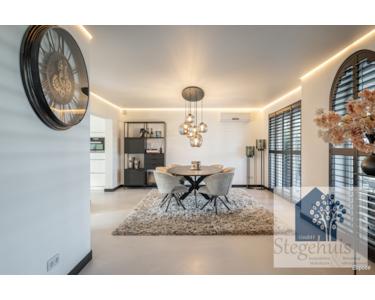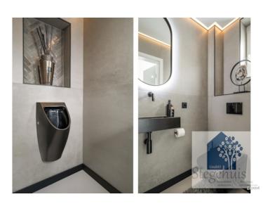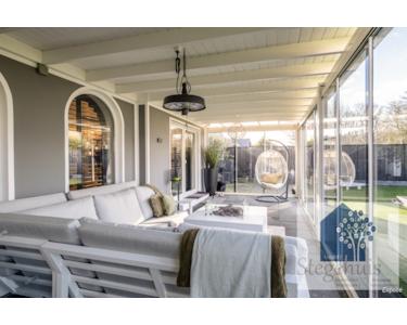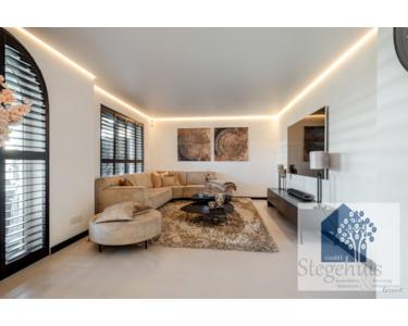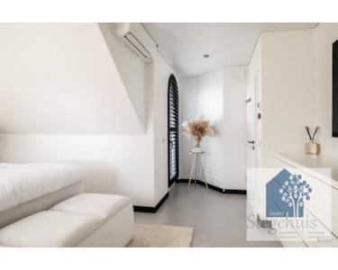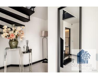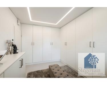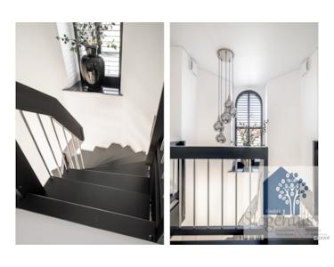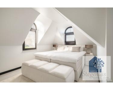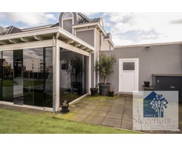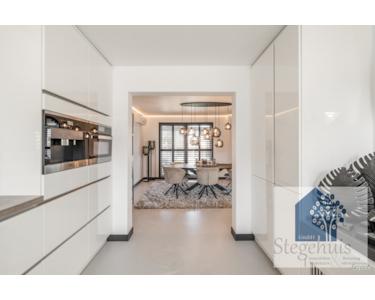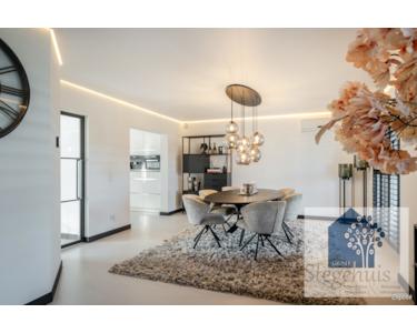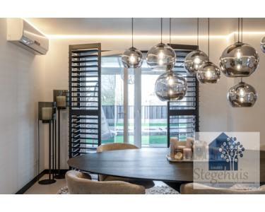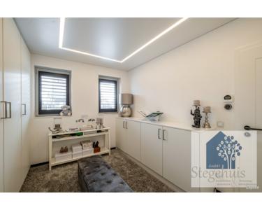 Schon beim Betreten der Halle erleben Sie die gesamte hoteleigene Atmosphäre des Hauses; Modern, elegant, aber mit einer warmen, luxuriösen Note. Dies spiegelt sich unter anderem im hier beginnenden Gussboden wider, kombiniert mit den schwarzen hohen Fußleisten, der Stahltür zum Wohnraum und der schwarzen Wendeltreppe in den ersten Stock. Das Gäste-WC befindet sich in diesem Flur und ist mit Dusch-WC, Urinal und Waschbecken ausgestattet. Vom Flur aus gelangt man sowohl in das Wohnzimmer als auch in das erste Schlafzimmer, wobei wir hier mit dem Wohn- und Essbereich beginnen möchten. Darüber hinaus haben Sie von beiden Wohnräumen aus Zugang zum großen, komplett geschlossenen (mittels Glasschiebewand) Wintergarten. Dadurch ist noch mehr Wohnfreude entstanden, bei der Innen und Außen zusammenkommen. Die schöne und luxuriöse halboffene Küche ist mit dem Essbereich verbunden und in neutralen Tönen und ohne Griffe gehalten. Diese moderne Hochglanz-Winkelküche befindet sich im vorderen Bereich und verfügt über diverse Einbaugeräte. Alle Fenster im ganzen Haus verfügen über luxuriöse, maßgefertigte Fensterläden und selbst die Fenstertüren sind nicht zu übersehen. Das Schlafzimmer liegt ebenfalls an der Vorderseite und verfügt über geräumige Einbauschränke.
