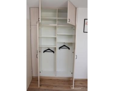 Schlafzimmer mit 2 Betten 90x200 cm (zusammenstellbar), Regal als Raumtrenner, Einbauschrank, Kleiderschrank, Kommode.