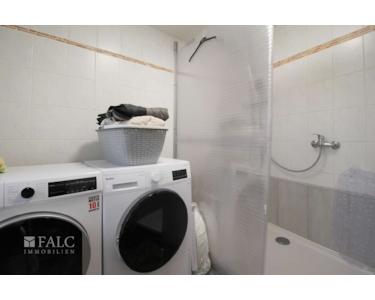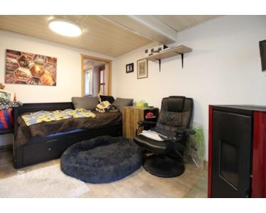 Die Wände im Wohnzimmer sind in neutralen Tönen gehalten, was eine angenehme Atmosphäre schafft. Der Pelletofen sorgt für wohlige Wärme. Das Badezimmer ist praktisch eingerichtet und verfügt über eine Dusche sowie einen Waschmaschinenanschluss. Die hellen Fliesen tragen zur freundlichen Ausstrahlung des Raumes bei.