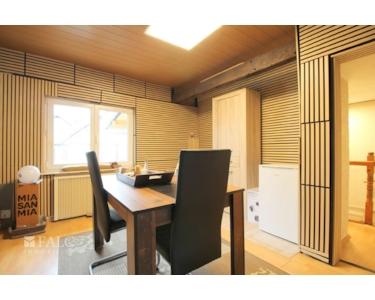 Im Obergeschoss befinden sich das Esszimmer sowie das Schlafzimmer, das durch seine ruhige Lage einen erholsamen Rückzugsort bietet. Der angrenzende Balkon ist als Wintergarten ausgestaltet und lädt dazu ein, den Tag hier mit einem Kaffee zu beginnen.