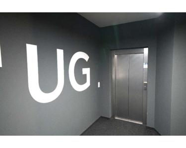 Das moderne Bürogebäude ist mit einem Aufzug und verspiegelten Sonnenschutzfenstern versehen.