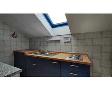 Die Küche mit 2 Küchenzeilen, einer Kochgelegenheit, einem Spülbecken und einem Dachfenster
