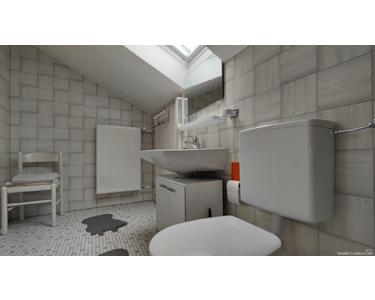 Das helle Tageslicht-Badezimmer mit einem Waschbecken, WC und Dusche