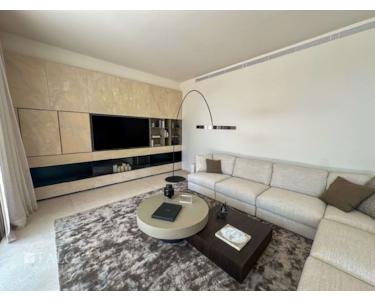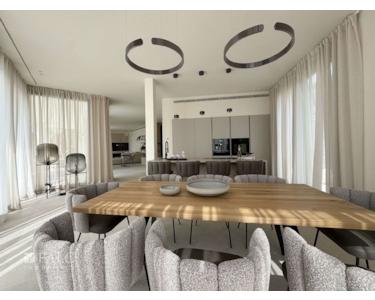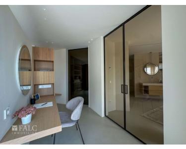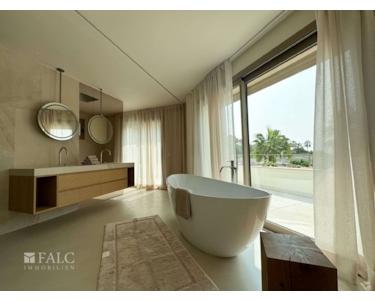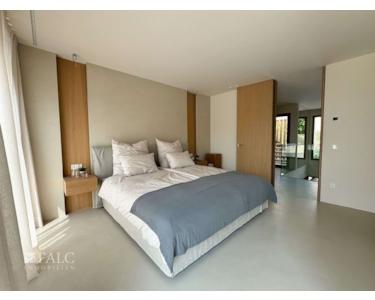 Auf zwei Etagen verteilen sich insgesamt 5 Zimmer, darunter 4 Schlafzimmer und 6 Bäder. Der großzügig geschnittene Wohnbereich mit bodentiefen Fenstern und Zugang zur Terrasse lässt viel Licht in die Villa und bietet einen traumhaften Blick auf den gepflegten Garten mit Pool.
