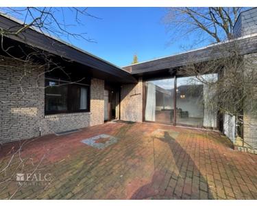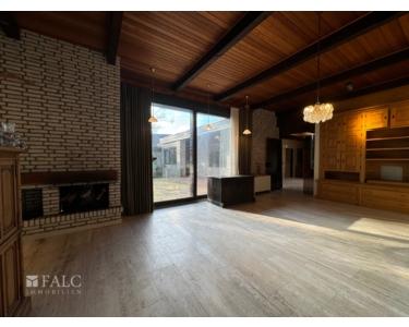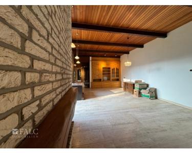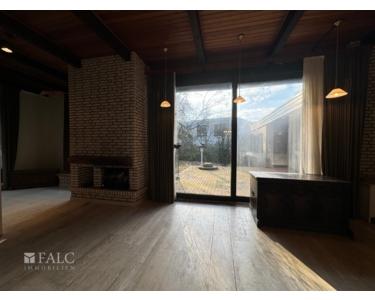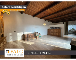Willkommen in diesem großzügigen freistehenden Einfamilienhaus, das mit einer Wohnfläche von ca. 180 m² viel Platz für individuelle Gestaltungsmöglichkeiten bietet. Der Eingangsbereich besticht durch seine offene Gestaltung und führt direkt in das helle Wohnzimmer. Hier fällt das Licht durch große Fensterfronten, die den Raum mit natürlichem Licht durchfluten und einen angenehmen Ausblick auf den Garten bieten. Die Decken sind mit Holz verkleidet, was dem Raum eine warme und einladende Atmosphäre verleiht.