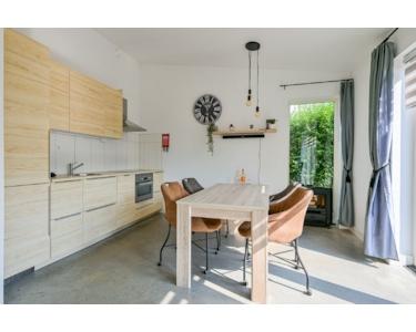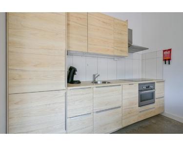 Gepflegte Küche mit Kühl-Gefrierkombination, Induktionskochfeld, Dunstabzugshaube, Geschirrspüler und Backofen.