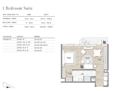 Ein stilvolles Wohnzimmer, eine offene Küche mit hochwertigen Geräten, ein großzügiges Schlafzimmer und ein elegantes Badezimmer machen dieses Apartment zu einem perfekten Rückzugsort für anspruchsvolle Bewohner.