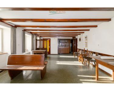Das Zweifamilienhaus ist in zwei separate Wohneinheiten unterteilt, die insgesamt sechs Zimmer, zwei Küchen und einen großzügigen Gastwirtschaftsraum umfassen. D...