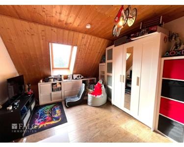 Ein weiteres Zimmer kann flexibel genutzt werden, sei es als Arbeits-, Kinderzimmer oder für Hobbys. Die Holzvertäfelung und das Dachfenster schaffen eine helle und freundliche Umgebung.